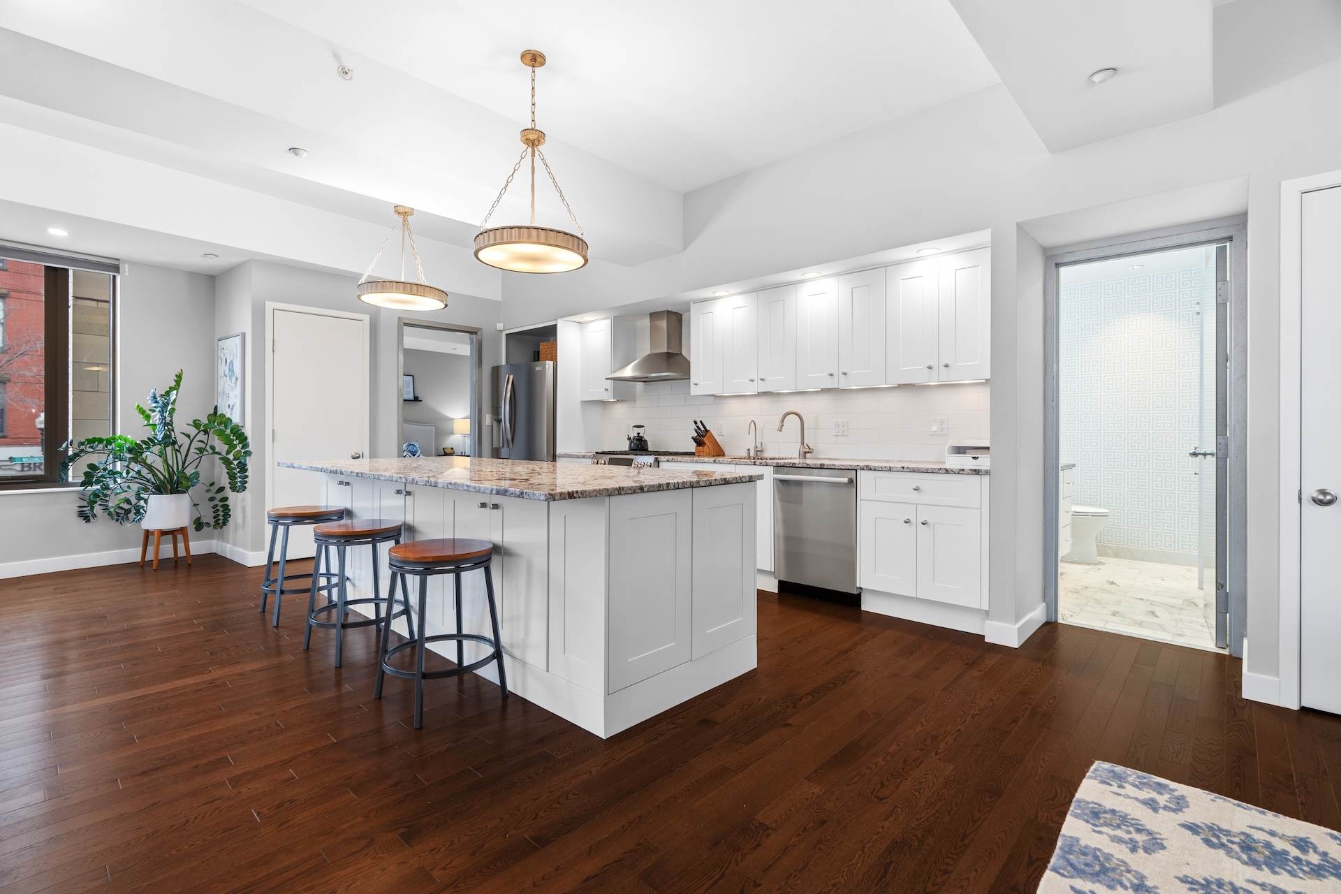 Rarely available southeast-facing corner residence at Wilkes Passage. This expansive 3BD/2BA home is defined by two walls of oversized windows showcasing treetop and Peter’s Park views, filling the open living/dining areas with natural light. Elegant coffered ceilings and hardwood floors enhance the generous living space. The renovated kitchen features stainless appliances, custom cabinetry, dual pantries, and a striking 10’ granite island, with an adjacent dining area suited for large gatherings. The sunlit primary suite offers ample closets, dressing area, and a tiled bath with walk-in shower. A flexible floor plan includes 2 additional bedrooms with custom glass panel doors and large closets, and the guest bath features Carrera marble and in unit laundry. Central AC plus one full garage parking space is included. Residents enjoy 24/7 concierge, a landscaped courtyard and spectacular roof deck with unsurpassed city views, in one of the South End’s most iconic full service buildings.